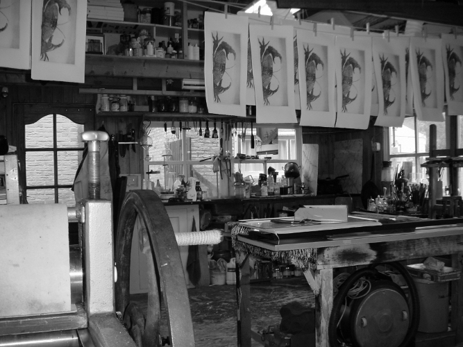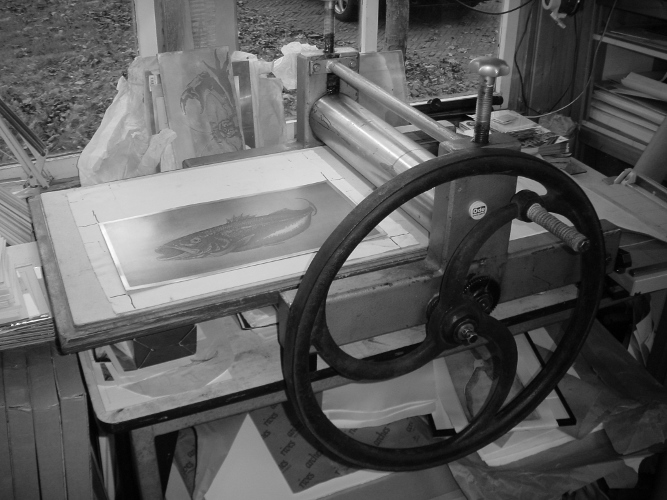 De uitgebeten dieper liggende afbeelding wordt vervolgens gevuld met drukinkt waarna de plaat samen met handgeschept en vochtig gemaakt papier door de etspers wordt gehaald. Na het uitvlakken tussen twee platen marmer worden de etsen linksonder genummerd: het aantal afdrukken en het unieke nummer van de ets.