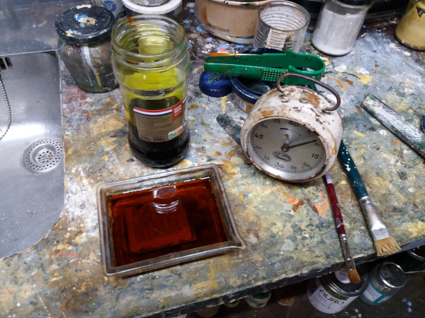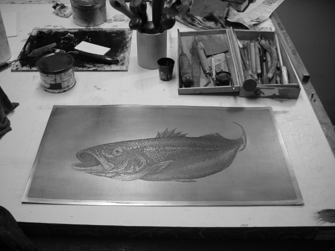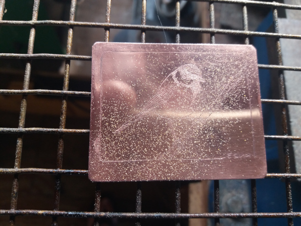 De hierdoor bloot liggende lijnen worden uitgebeten door de plaat in een zuurbad te leggen.