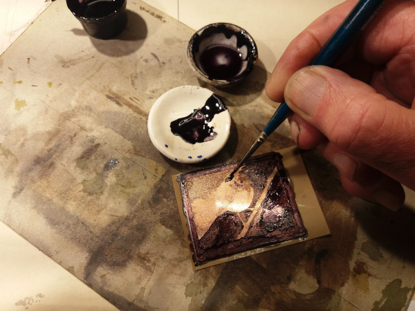 Voor de grijstinten, de z.g. aquatint, worden zeer kleine harskorreltjes op de plaat gesmolten.